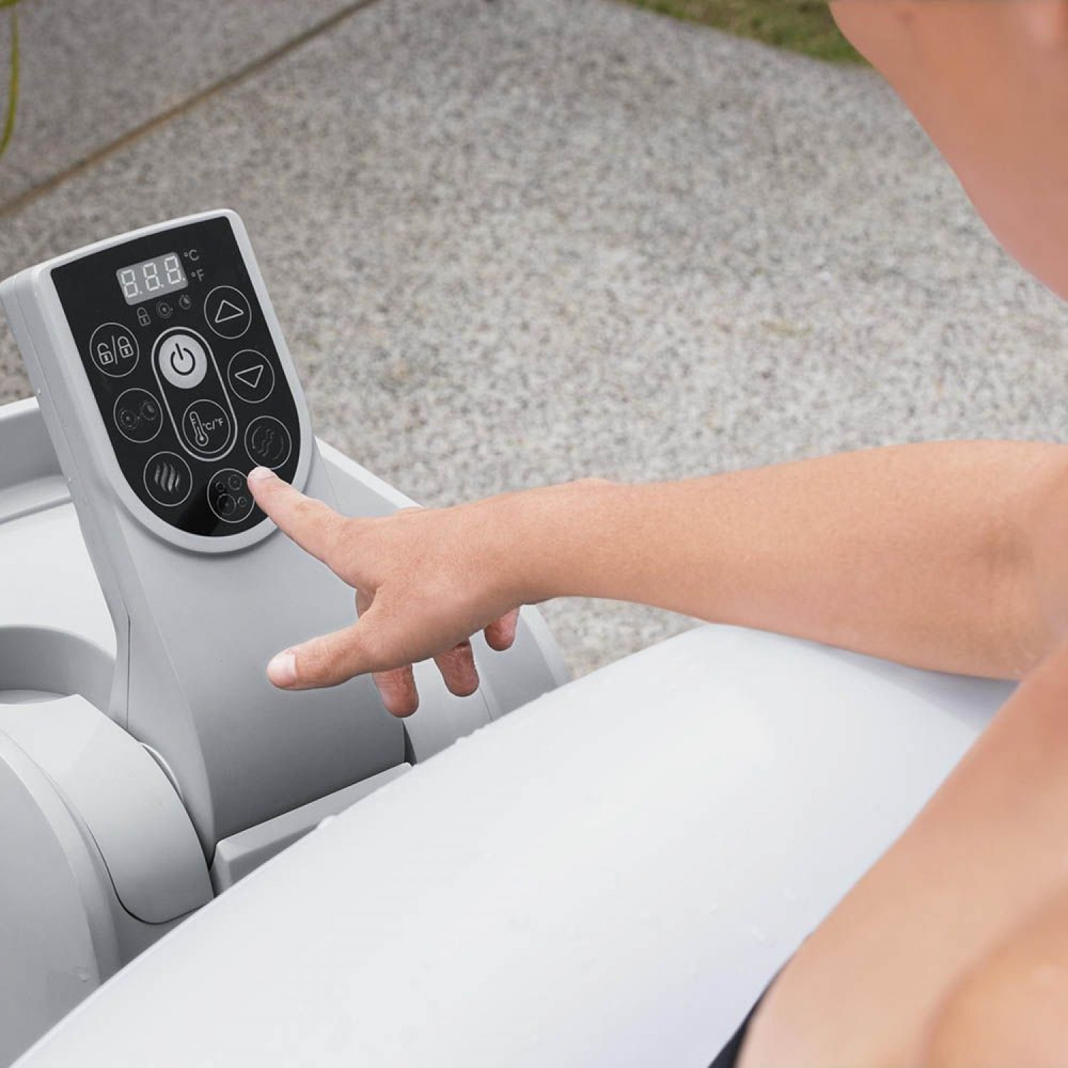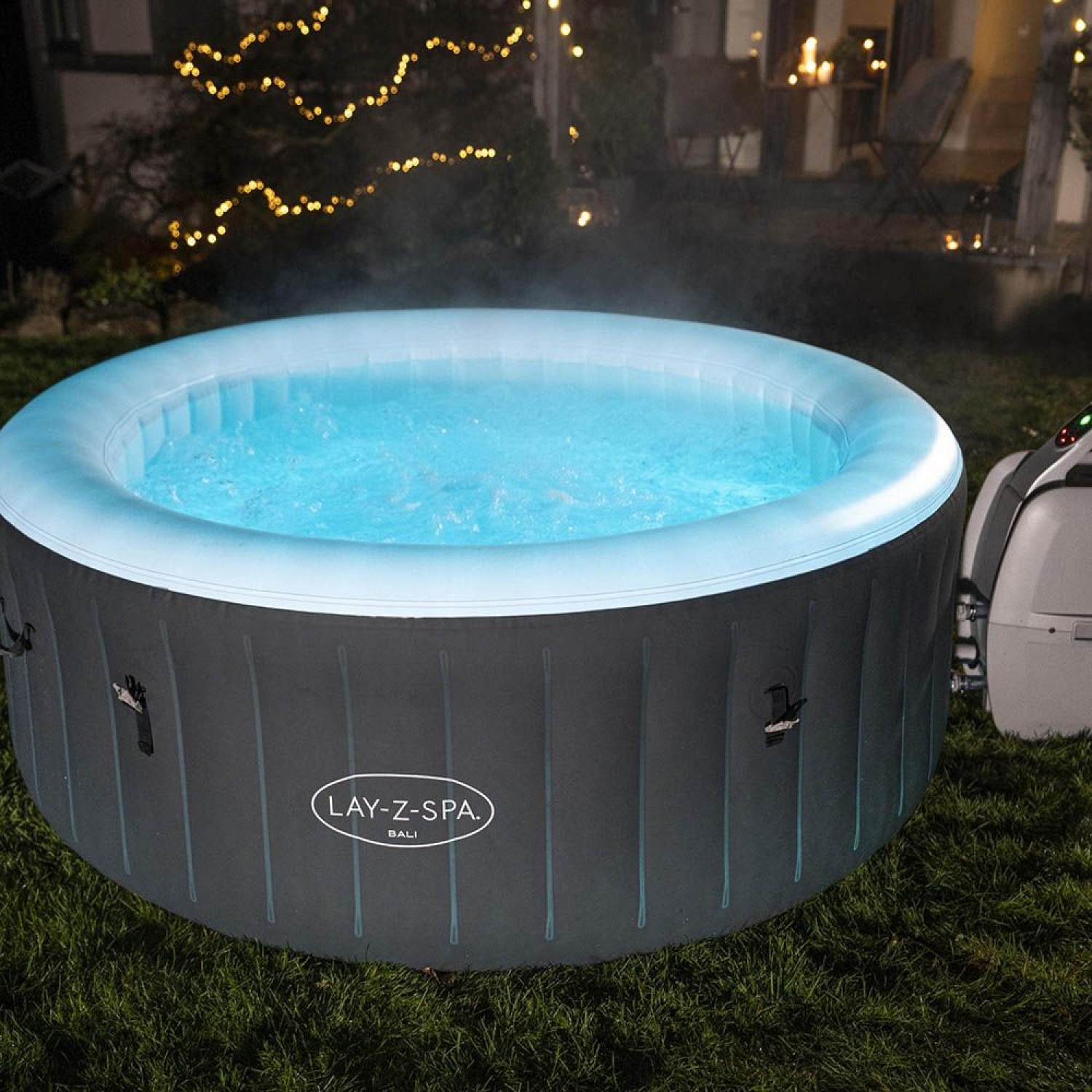 Lay-Z-Spa Bali AirJet™ este un răsfăț elegant în grădina sau pe terasa ta.Acest model de jacuzzi se instalaeaza printr-o singură apăsare de buton, se încălzește prin comandă digitală, și, - desigur- este portabil. Poți achiziționa setul complet, totul va fi gata pentru utilizare. Culoarea gri deschis oferă eleganță și stil. Carcasa este iluminată cu o banda de LED RGB integrată cu telecomdandă.